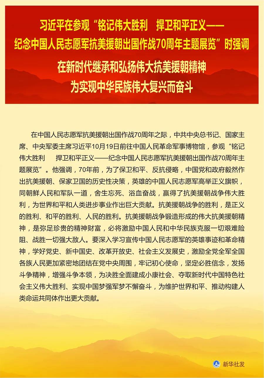 在中国人民志愿军抗美援朝出国作战70周年之际,中共中央总书记、国家主席、中央军委主席习近平19日前往中国人民革命军事博物馆,参观“铭记伟大胜利 捍卫和平正义——纪念中国人民志愿军抗美援朝出国作战70周年主题展览”。他强调,70年前,为了保卫和平、反抗侵略,中国党和政府毅然作出抗美援朝、保家卫国的历史性决策,英雄的中国人民志愿军高举正义旗帜,同朝鲜人民和军队一道,舍生忘死、浴血奋战,赢得了抗美援朝战争伟大胜利,为世界和平和人类进步事业作出巨大贡献。抗美援朝战争的胜利,是正义的胜利、和平的胜利、人民的胜利。抗美援朝战争锻造形成的伟大抗美援朝精神,是弥足珍贵的精神财富,必将激励中国人民和中华民族克服一切艰难险阻、战胜一切强大敌人。要深入学习宣传中国人民志愿军的英雄事迹和革命精神,学好党史、新中国史、改革开放史、社会主义发展史,激励全党全军全国各族人民更加紧密地团结在党中央周围,牢记初心使命,坚定必胜信念,发扬斗争精神,增强斗争本领,为决胜全面建成小康社会、夺取新时代中国特色社会主义伟大胜利、实现中国梦强军梦不懈奋斗,为维护世界和平、推动构建人类命运共同体作出更大贡献。