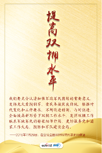 习近平总书记始终高度重视双拥工作,多次在重要会议、国内考察时亲力亲为指导推动。他强调拥军优属、拥政爱民是我党我军特有的政治优势,坚如磐石的军政军民关系是我们战胜一切艰难险阻、不断从胜利走向胜利的重要法宝。
