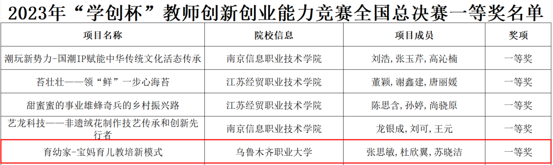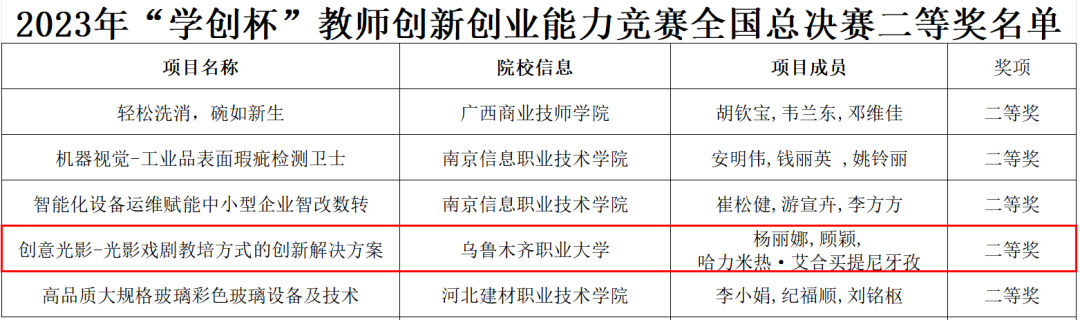 近日,在2023年“学创杯”全国教师创新创业教学竞赛总决赛中,我校师范学院教师喜获佳绩。其中张思敏、苏晓洁、杜欣翼团队荣获全国一等奖,杨丽娜、顾颖、哈力米热·艾合买提尼牙孜团队荣获全国二等奖。