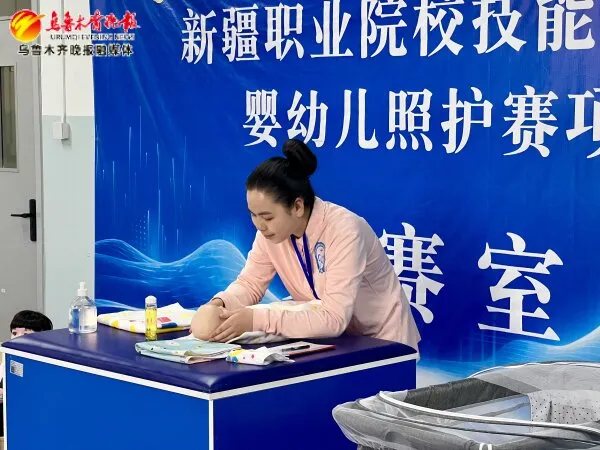 手部消毒、检查纸尿裤、更换隔尿垫……2月27日,2025年新疆职业院校技能大赛婴幼儿照护赛项在乌鲁木齐职业大学文光校区举行。