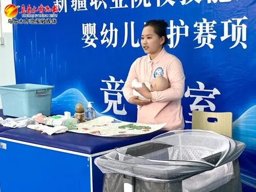 在婴幼儿保育技能考核与测评中,博尔塔拉职业技术学院学前教育专业大一学生张嘉芮抽到的题目是婴幼儿生活照料,她需要在8分钟的时间内对婴儿进行喂奶、拍嗝、更换纸尿裤、安抚。