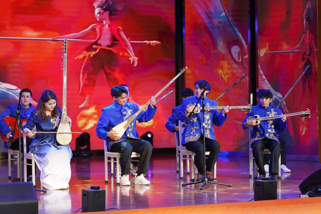 随后,我校各社团带来了精彩纷呈的民乐、歌曲、京剧、舞蹈等节目表演。开幕式还邀请了著名表演艺术家、国家一级演员高建新带来的相声《乌鲁木齐职业大学亚克西》,邀请新疆艺术剧院杂技团伊丽达娜·米吉提老师带来的杂技表演,赢得了现场观众的热烈掌声。乌鲁木齐市青联委员张希成倾情演绎《石榴籽一样》《向云端》,歌声悠扬,点燃全场热情。