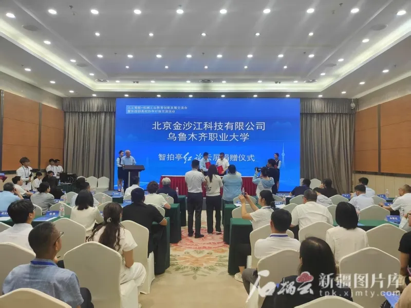 活动现场,北京金沙江科技有限公司向新疆农业职业技术大学等新疆7所高校捐赠了用于图像采集的智能拍照亭和用于党建学习的红旗云屏。