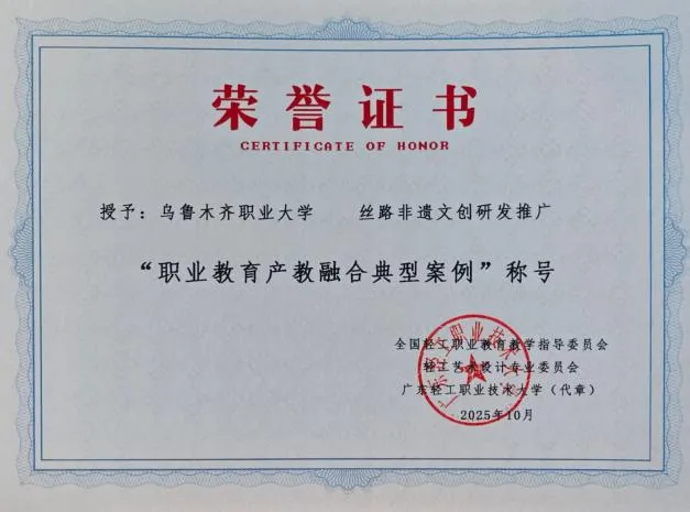 10月24日至26日,第二届全国艺术与设计类职业教育产教融合博览会在北京中关村国际创新中心举办。我校艺术学院申报的“丝路非遗文创研发推广项目”获评“职业教育产教融合典型案例”并被载入《2025年中国广告年鉴》。艺术学院院长曹庆梅教授受聘为全国轻工职业教育教学指导委员会轻工艺术设计专业委员会智库专家。