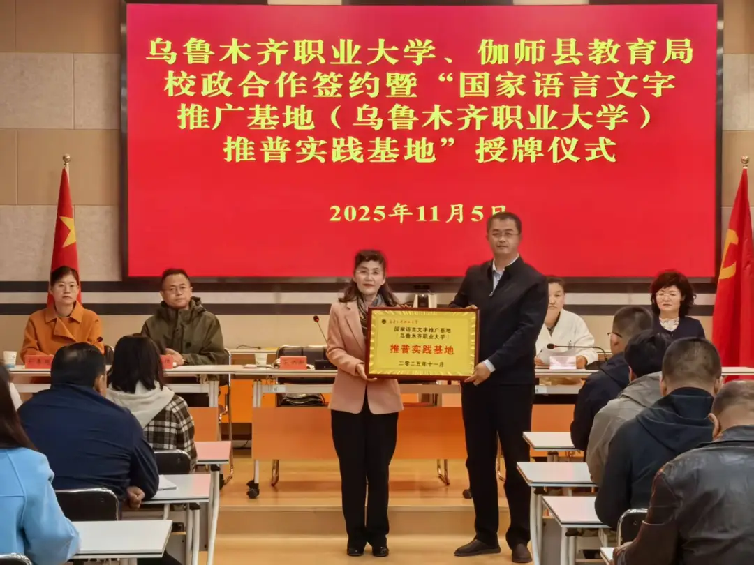 调研期间,国家语言文字推广基地(乌鲁木齐职业大学)与伽师县教育局正式签订校政合作协议,并为“国家语言文字推广基地(乌鲁木齐职业大学)推普实践基地”揭牌;同时,与伽师县和夏阿瓦提镇中学、米夏乡恰喀村分别签订合作协议,挂牌“国家语言文字推广基地(乌鲁木齐职业大学)语言文字服务站”并捐赠国家通用语言文字学习资料。此次签约挂牌标志着校地双方在语言文字推广领域的合作迈出实质性步伐,将进一步整合双方资源优势,构建长效合作机制。