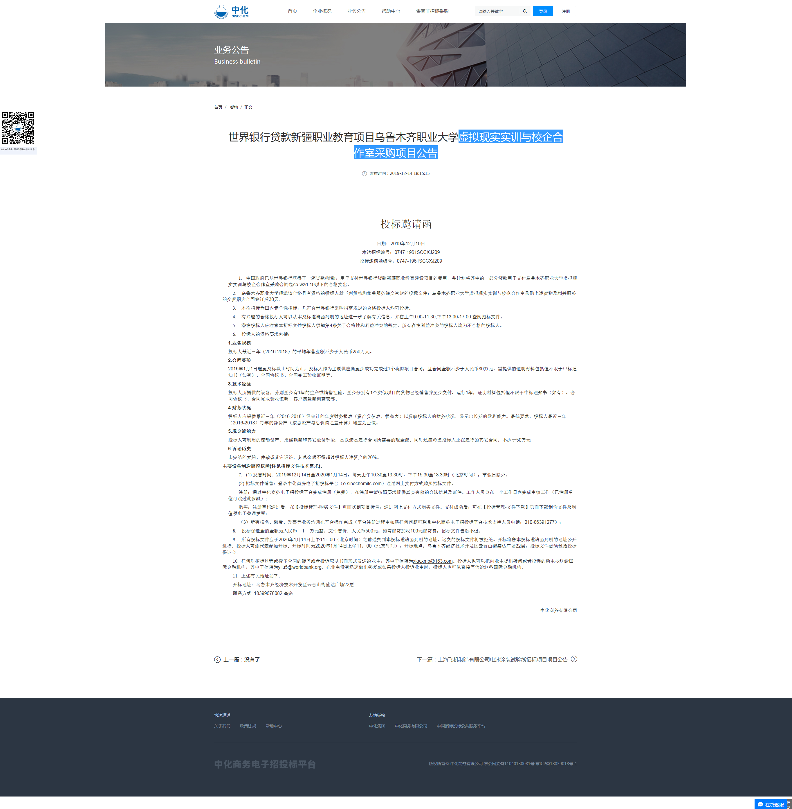 世行贷款新疆职业教育项目乌鲁木齐职业大学虚拟现实实训与校企合作室采购项目公告